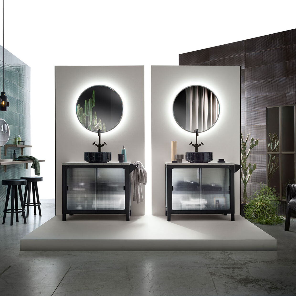 The Misfit Cart unit is in Grey Soft matt painted metal with Mineralmarmo worktop. The composition is completed by the Plug Sink Mineralmarmo sit-on washbasin and the Bronze-finish Lunar mirror. On the right, bathroom cabinet with Titanium finish frame and Bronze glass doors.
